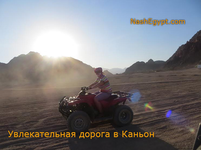 Эта экскурсия вызвала у нас много вопросов…а какая скорость, а что одевать, а пыли много, сложно ли…и как все будет… Как прошло – рассказываю.)) Форма одежды – произвольная.. кто боится обгореть – можно длинный рукав. Можно в шлепанцах, но лучше сандалии. Мотор у квадро горячий – лучше бриджи. Очки солнцезащитные, но кто с диоптриями носит – без проблем катайтесь в них ) Арафатка в обязательном порядке. Основа пустыни каменистая и пыль столбом не стоит, быстро рассеивается. Так что видимость была хорошая, если чуток на расстоянии ехать. Скорость до 40-50 км в пелотоне, но это максимум, средняя меньше. Так что экстрим был у нас умеренный. Гарантирую, вам тоже понравится .)) Юля, моя подружка, со страхом ехала туда, поддавшись на мои уговоры, причитая – куда я еду, что я там забыла….возвращалась с горящими глазами и обещанием обязательно повторить )) Ехали с таким расчетом, чтобы встретить закат в пустыне..Катались 4 часа- по 2 часа на каждом транспортном средстве. Кричали, стараясь поймать эхо.. Встретили закат и в темноте возвращались, освещая путь фарами. Квадрики качественные- моторы не глохли как в Турции. А багги вообще как игрушка, коробка- автомат. Одной рукой водишь – второй щелкаешь фотиком. Желательно на разумной скорости , бо чем больше скорость тем выше и жестче кочки.)) Я разгонялась до 45-47 км., ехала зигзагами, пропускала верблюдов, подсвечивала фарами дорогу на обратном пути тем квадрикам, у кого фар не было.В общем получили море удовольствия. Там было и шоу бедуинов но мы не брали его. ИМХО – нам понравилось днем кататься – видишь куда едешь. ) С организацией проблем не было – привезли – увезли. Так что – рекомендую! ))